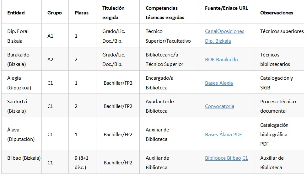 Tabla 1: Análisis de convocatorias de empleo bibliotecario en Euskadi (2025)